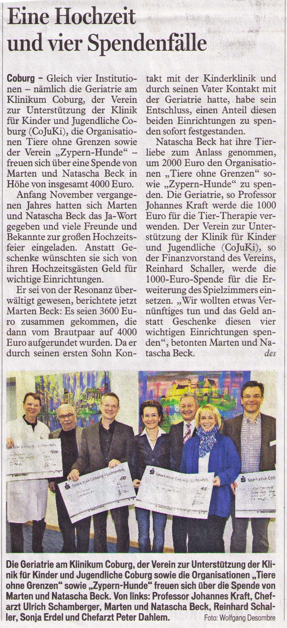 - Eine Hochzeit und vier Spendenfälle, Coburger Tageblatt, 2.Januar 2014